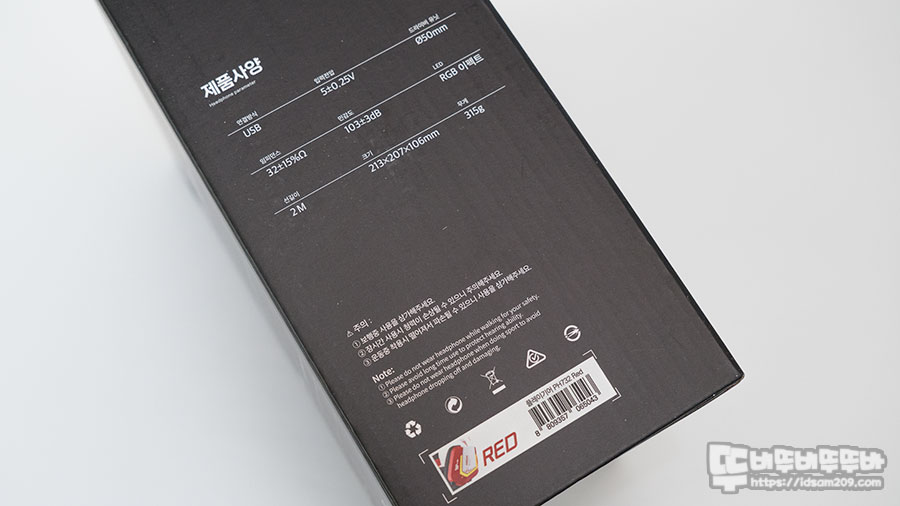 패키지 뒷면에는 제품의 특징이 인쇄된 인체공학 디자인과 촉감이 좋은 최고급 이어패드, RGB 이펙트, 편안한 착용감, 스틸 헤어밴드 등에 설명이 인쇄되어 있습니다.