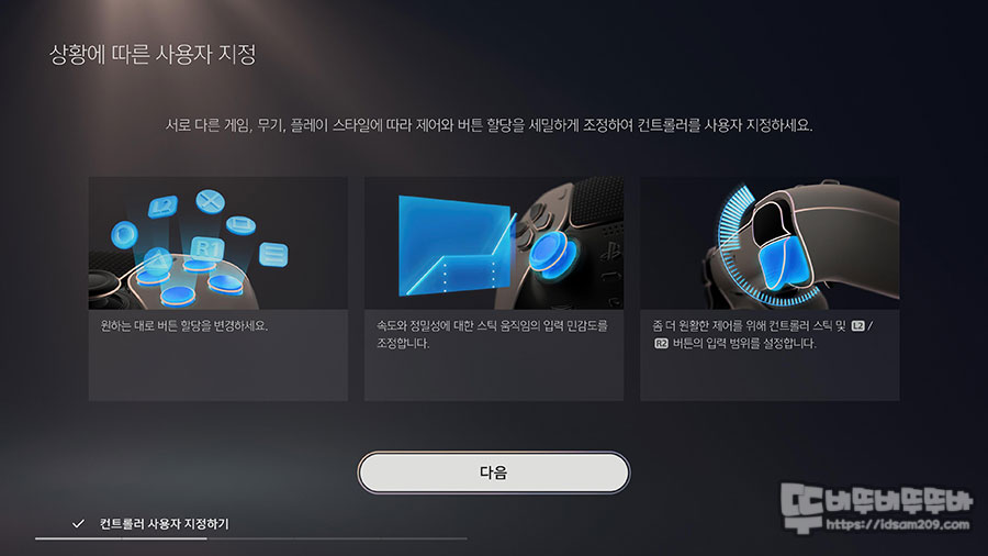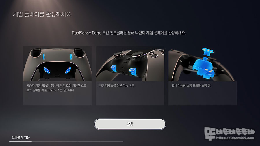 가이드 화면에서는 듀얼센스 엣지의 특징에 대해서 언급하고 있으며 "다음" 버튼을 눌러서 스킵하는 형태로 안내하네요.