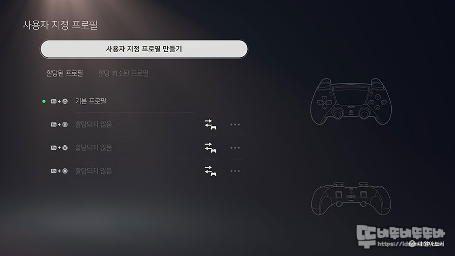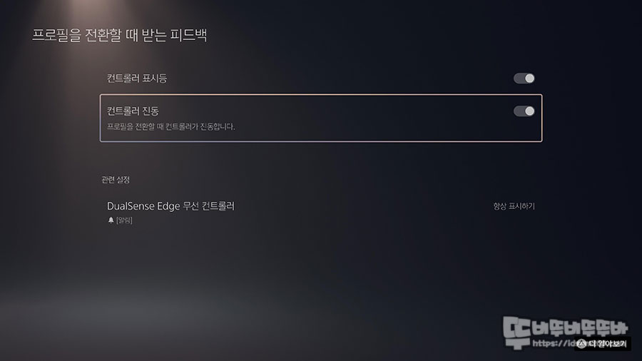 액세사리 메뉴에서는 듀얼센스 엣지 항목이 따로 존재하며 사용자 지정 프로파일 이외에 부수적인 On/Off 설정으로 구성되어 있습니다.