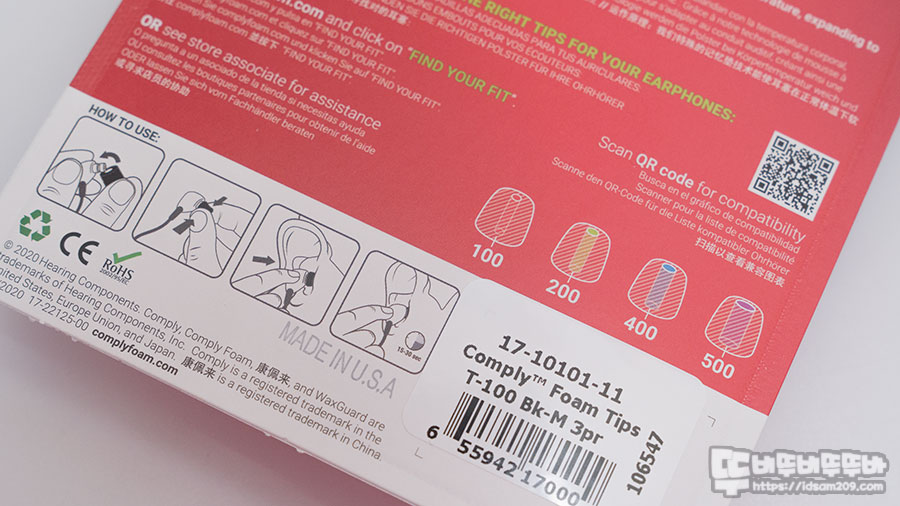 전면에는 에이팟프로 1세대, 2세대 호환으로 표기하고 있으며 뒷면는 장착 방법과 바코드 위에 44-50201-21 제품 코드 그리고 Airpods Pro BLK-M 3pr 즉, 에어팟프로용 블랙컬러, M사이즈, 3페어라는 내용이 적혀있는 것을 확인할 수 있네요.