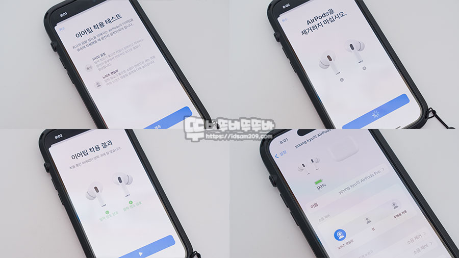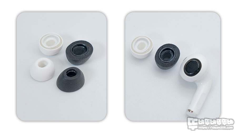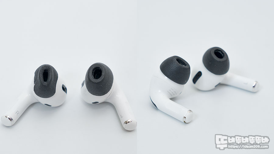 기존의 실리콘 이어팁과 차이라면 당연한 이야기겠지만 귓구멍을 꽉 채워주고 있어 에어팟프로의 노이즈캔슬링 기능을 실행하면 차음이 더 잘 되는 느낌이 팍 느껴집니다.