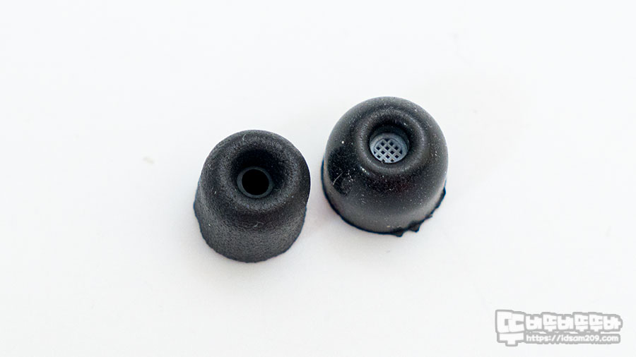 왼쪽 Isolation 100, 오른쪽 슈어 SE215 SE 기본 폼팁 모습.