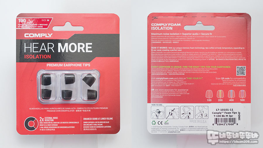 Isolation 시리즈는 패키지에 전면에 폼팁 사이즈 SIZE M 및 모델명 100 표기를 확인할 수 있으며 패키지 뒷면에 Isolation 시리즈 넘버링 차이를 표현하는 내용도 확인할 수 있으니 참고하시기 바랍니다.