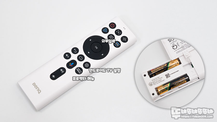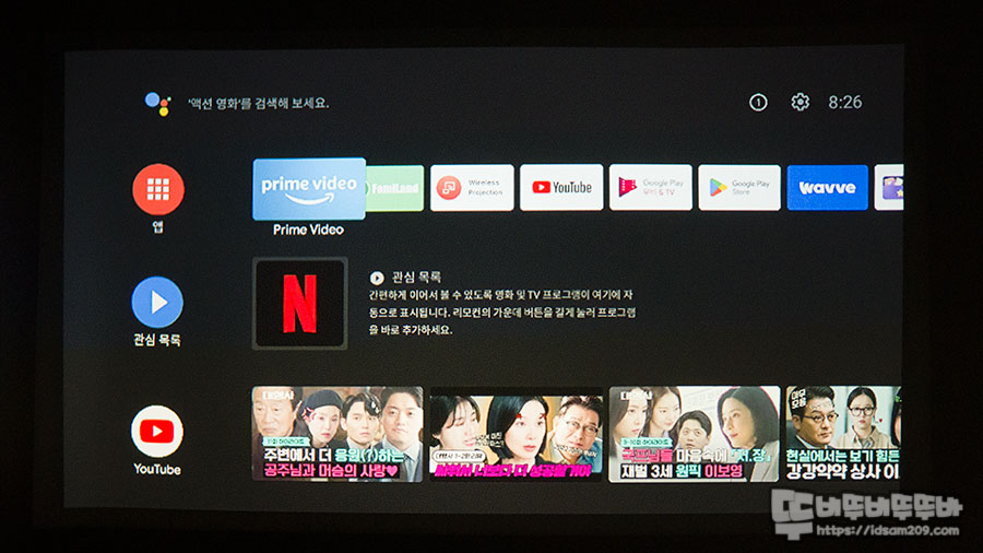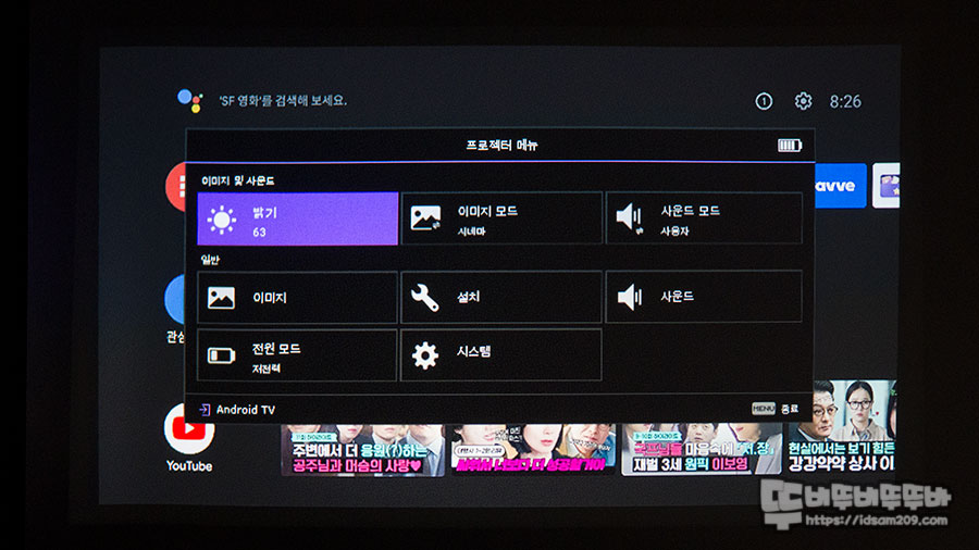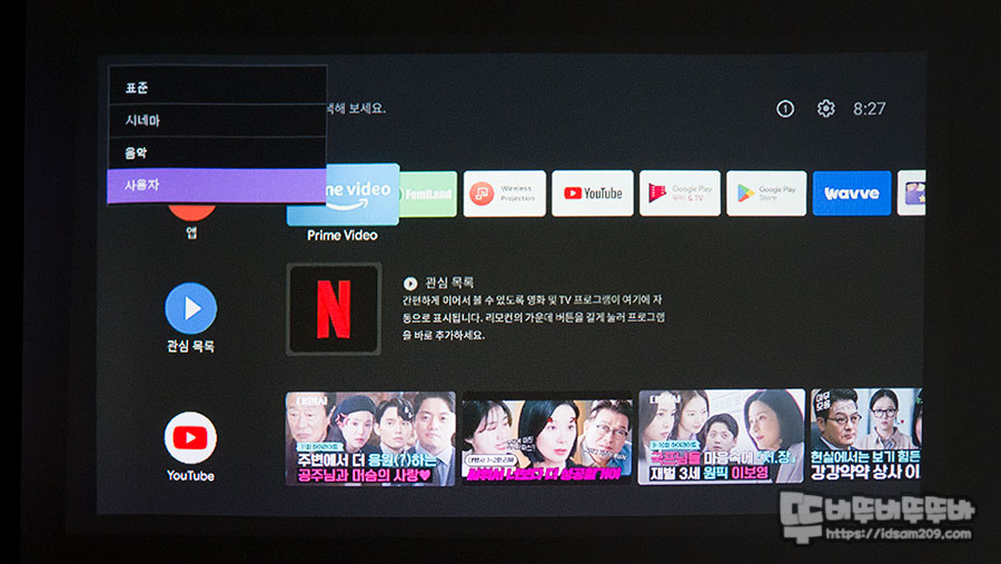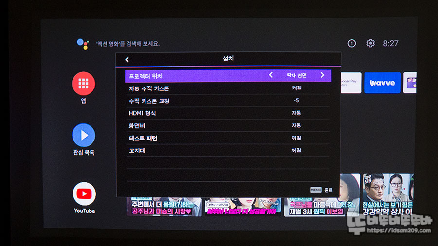 안드로이드 TV OS가 내장된 제품이기에 빔 프로젝터의 디테일한 조작은 리모컨을 활용하셔야 하니 참고하세요.