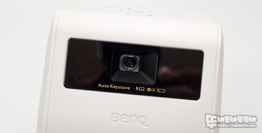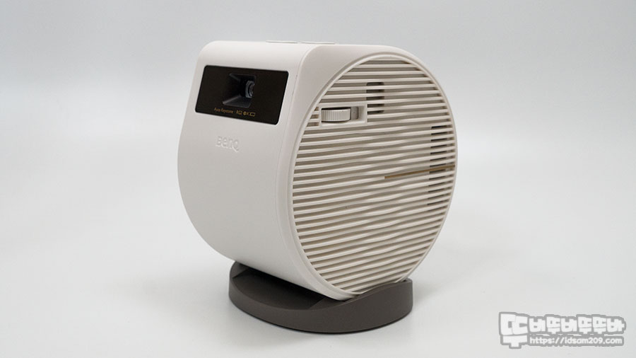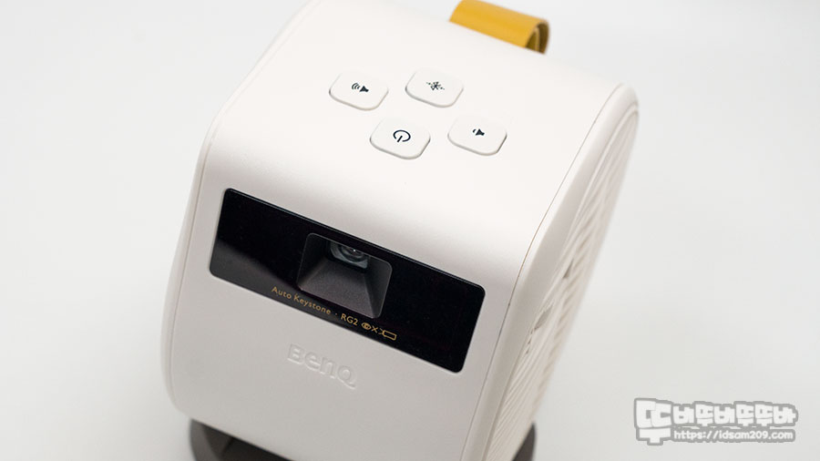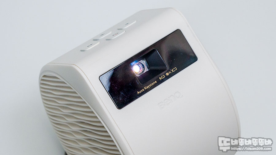 전면에는 프로젝터 렌즈와 BenQ 로고를 확인할 수 있으며 제품 상단에는 간단하게 조작할 수 있는 전원 버튼과 볼륨 및 블루투스 연결 버튼으로 구성되어 있습니다.