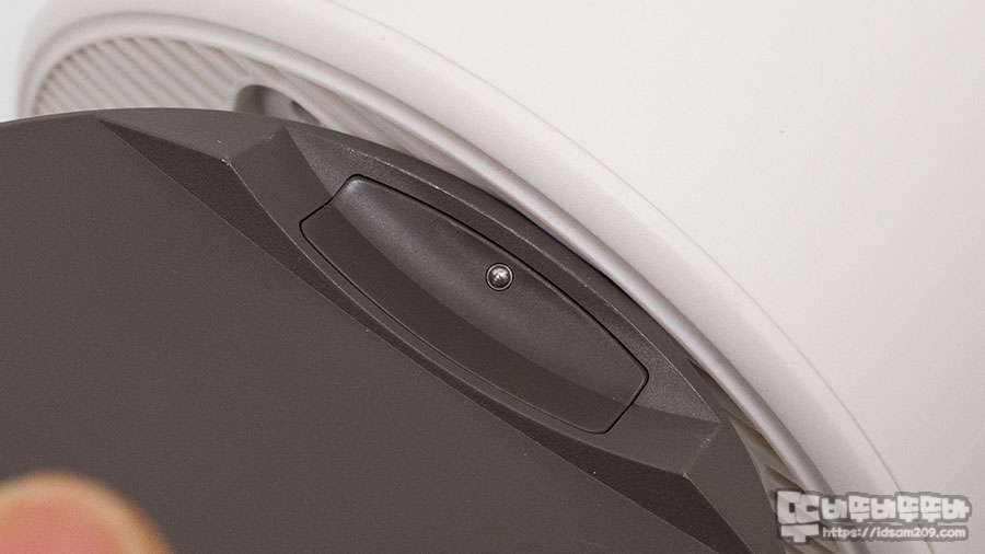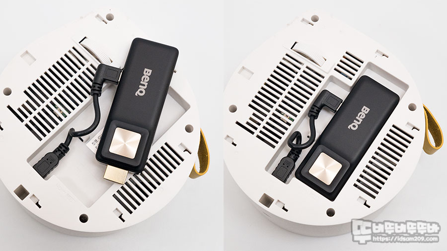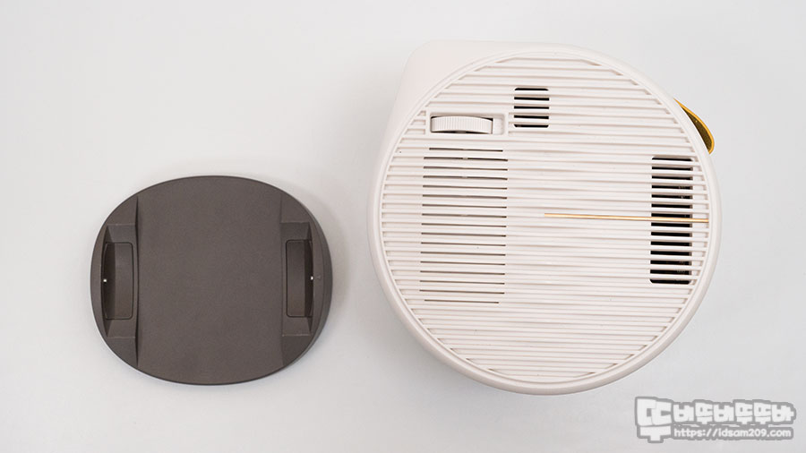 나름 중요한 BenQ GV11 포터블 빔프로젝터와 받침대 구조를 간단하게 살펴보면 받침대 끝부분에 위치한 구슬 같은 돌기가 프로젝터 본체 측면에 원형으로 파인 가이드 부분에 결합되면서 고정되는 구조인데요.
