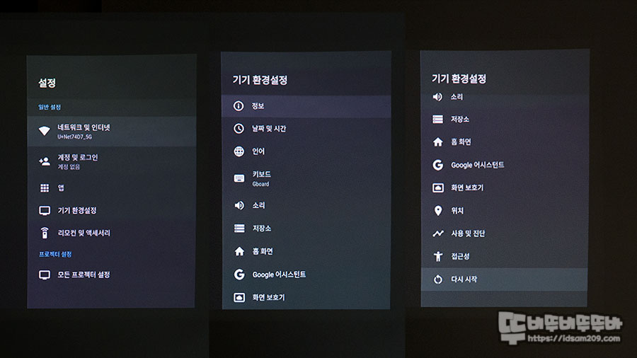 안드로이드 TV OS가 내장된 제품이기에 빔 프로젝터의 디테일한 조작은 리모컨을 활용하셔야 하니 참고하세요.