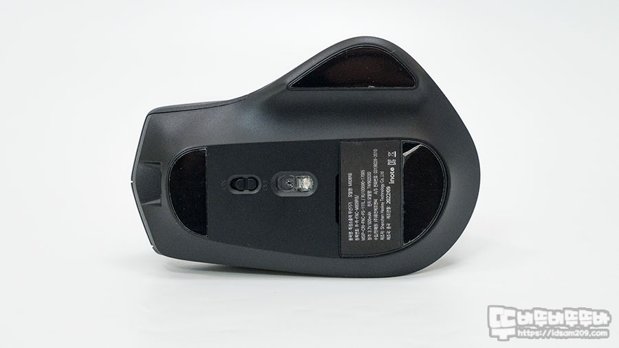 마우스 왼쪽 부분은 엄지손가락 부분이 올려지는 날개 디자인과 앞, 뒤 사이드 버튼 앞에는 3가지 연결 방식을 선택하는 페어링 버튼과 연결상태 및 DPI 단계를 표현하는 LED 인디게이터 모습을 확인할 수 있네요.