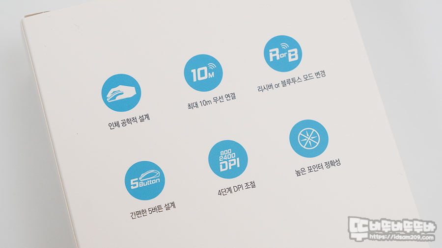 패키지 측면과 뒷면에는 블루투스 5.0, 최대 10m 무선 사용 가능, 멀티 페어링, 4단계 DPI 그리고 정확한 센서에 대한 특징을 강조하고 있습니다.