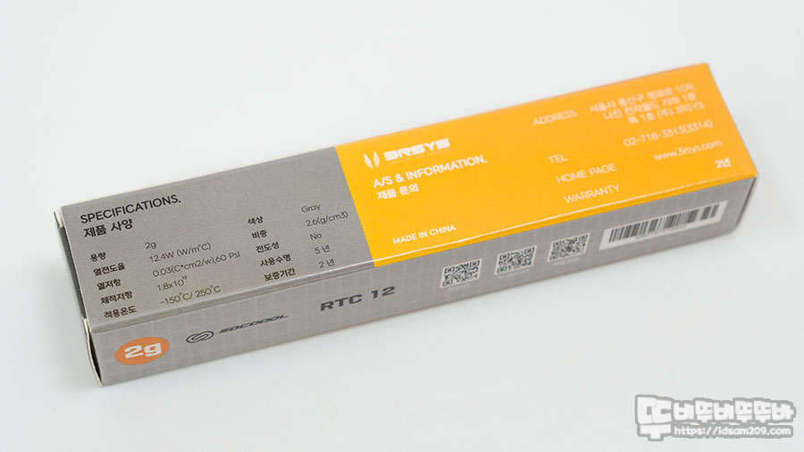 리뷰를 하는 3RSYS RTC12 써멀 컴파운드는 3RSYS Socoool RC1800 쿨러에 기본으로 제공되는 제품이지만 이번에 2g 용량과 4g 용량으로 개별 판매를 하게 되었습니다.
