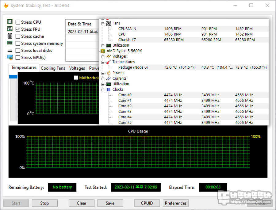 시스템 조립 후 AIDA64 - Sytem Stability test를 이용하여 Stress CPU 테스트와 부동소수점까지 끌어모아 테스트를 하는 Stress FPU 테스트를 6분간 진행하였으며 균일한 성능을 확인하기 위해 ASUS Fan Xpert - Full Speed로 설정하였습니다.
