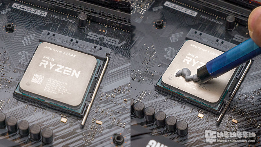 많이 사용하는 써멀 컴파운드의 점도를 테스트를 해보기 위해 RYZEN 로고에 R 글씨 크기만큼 짜고 스크래로 도포를 해 보았습니다.