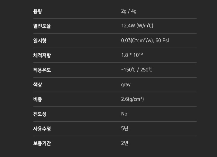 써멀 컴파운드 / 주사기형 / 용량: 2g / 비전도성 / 열전도율: 12.4W/mk / 밀도: 2.6g/cm3 / 2년의 정보를 확인할 수 있지만 브랜드마다 통일된 정보를 공개하지 않고 있기에 점도에 대한 비교는 불가능했습니다.