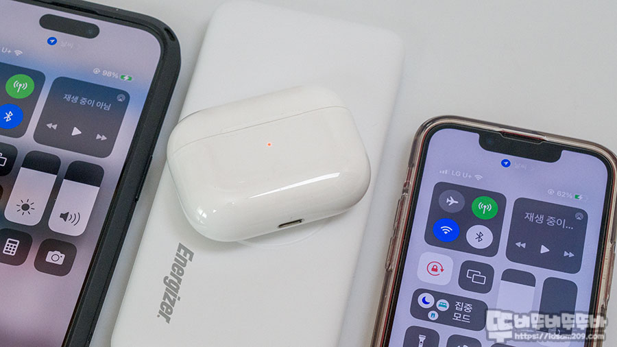 가장 먼저 진행 USB-C to 8핀 케이블을 이용한 유선 충전 모습과 무선으로 에어팟 프로를 충전하는 모습.