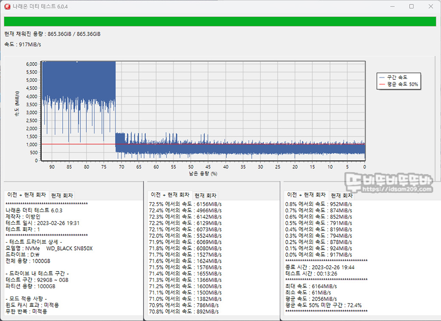 나래온 더티 테스트에서는 캐시 영역을 벗어나는 71.8% 정도에서 속도 하락을 하게 되는데 최대: 6,164MiB/s, 최소: 61 MiB/s, 평균: 2,056 MiB/s, 평균 50% 미만: 72.4% 성능을 보여주고 있습니다.