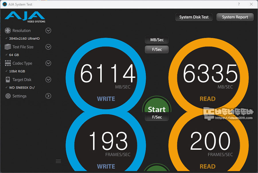 3840×2160 해상도(4K), 코덱 타입 10bit RGB, 파일 크기 64GB로 테스트 시 읽기 6114MB/s, 쓰기 6335MB/s 프레임으로 변환 시 초당 읽기 193 프레임, 쓰기 200 프레임 성능을 보여줍니다.
