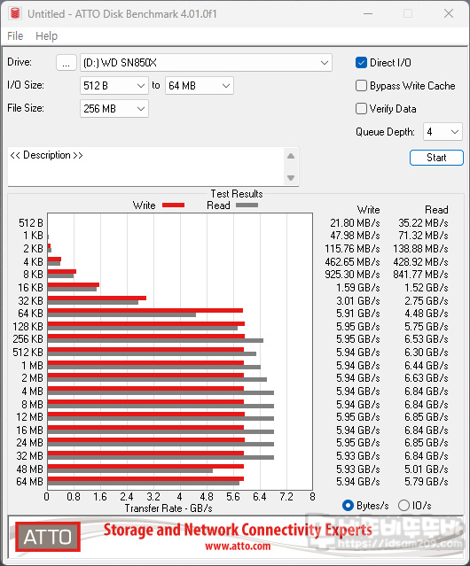 ATTO 디스크 벤치에서는 64KB부터 읽기 속도는 5.91 GB/s, 쓰기 속도는 4.48 GB/s 이상의 결과를 보여주고 있습니다.