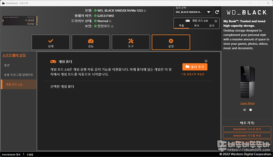 특히 초기 Black 모델 출시 때에는 게임용 SSD답게 게임 모드를 On/Off 기능을 제공했는데 이 기능을 사용하면 게임 중에 발생할 수 있는 스로톨링으로 인한 성능 저하를 방지하는 기능으로 SSD 성능 저하 없이 사용할 수 있었는데 최신 버전에서는 조금 향상된 2.0을 지원하는 게 특징입니다.