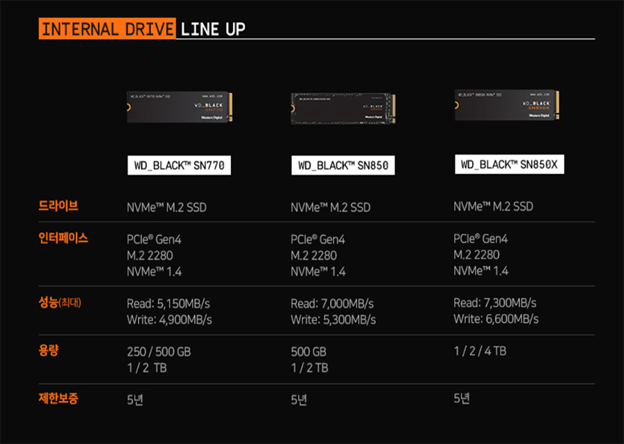 PCIe 4.0 기반의 WD SN850X 1TB M.2 SSD는 순차 읽기 7,300MB/s, 순차 쓰기 6,600MB/s ( 읽기 IOPS: 800K / 쓰기 IOPS: 1,100K), 보증기간 5년으로 넉넉한 보증을 해주고 있습니다.