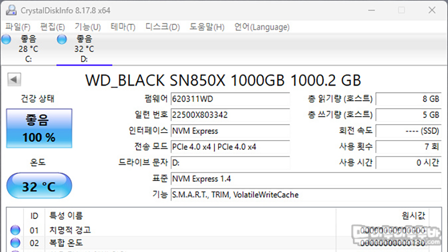 CrystalDiskInfo에서 제품 정보를 확인해 보면 PCIe 4.0 x4, NVM Express 1.4, S.M.A.R.T, Trim 등의 정보를 확인할 수 있는데요.