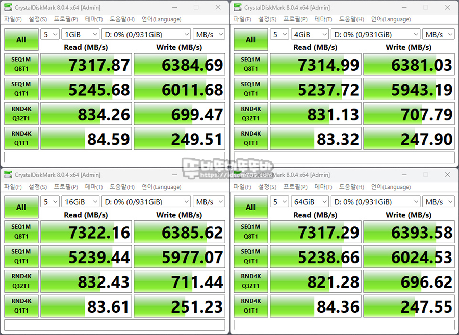 제품의 스펙 정보의 순차 읽기: 7,300MB/s / 순차 쓰기: 6,600MB/s에 준하는 속도를 보여주고 있는데 시스템에 따라 편차가 있을 수 있는 점 참고해 주시기 바랍니다.