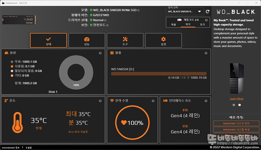 WD 홈페이지에서 다운받을 수 있는 대시보드 전용 소프트웨어를 사용 시 실시간 온도, 예상 수명, 인터페이스 정보, 드라이브 포맷, SMART 진단 테스트, Trim을 지원합니다.