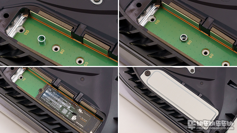 PS5 디스크 버전의 경우 디스크 쪽 커버를 오픈하고 철제 커버를 오픈 후 원형 스탠드오프를 2280 위치로 옮겨 WD SN850X를 장착 후 분해 역순으로 조립하시면 되는데요.