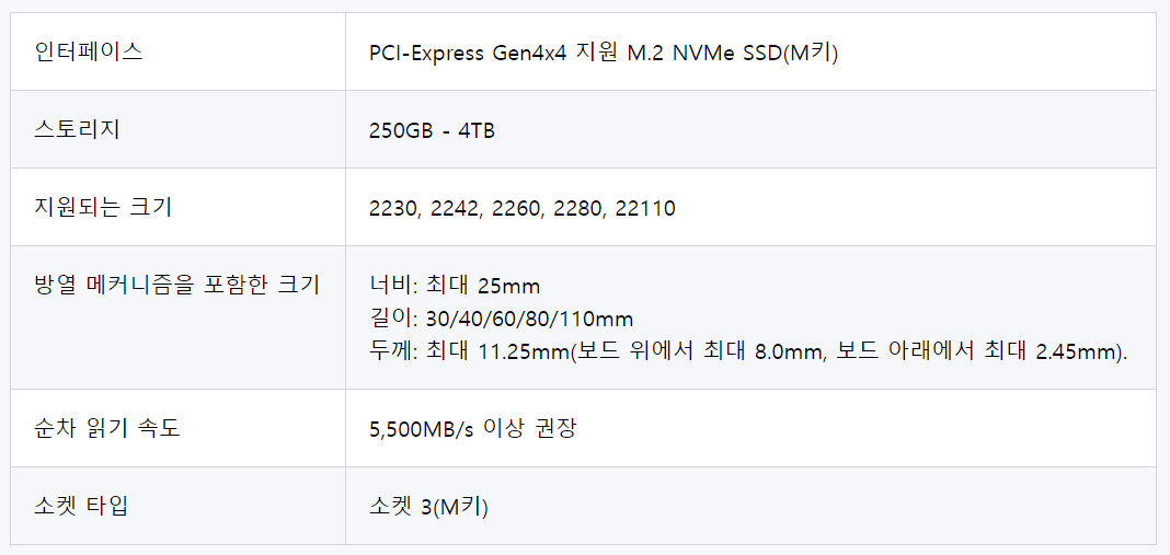 Gen4x4(PCIe 4.0) 지원하는 최소 5,500MB/s 속도를 지원하는 제품을 사용할 수 있으니 참고하시고요.