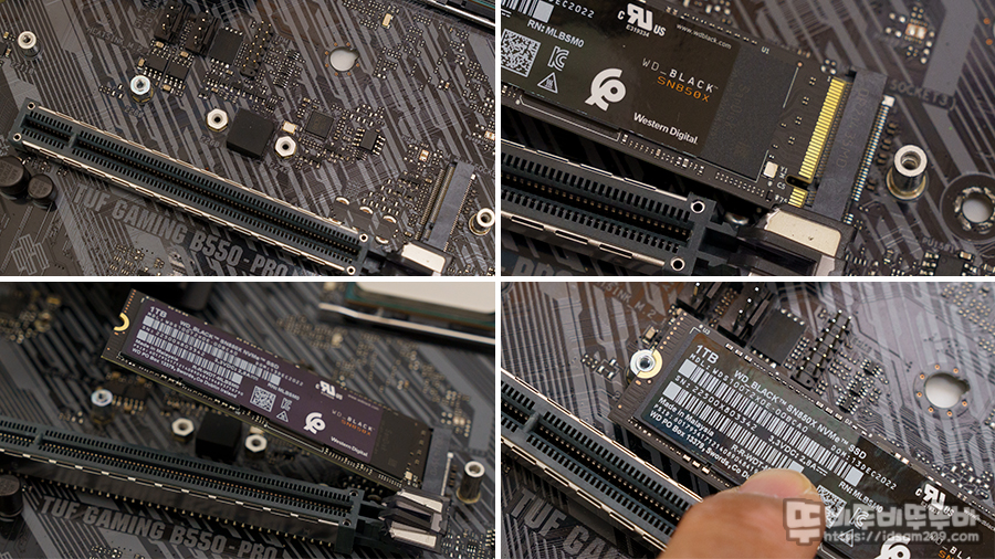 필자가 리뷰하는 ASUS TUF GAMING B550-PRO 메인보드는 히트싱크를 기본으로 제공되는 모델이기에 히트싱크를 분리 후 위의 사진과 같이 M.2 SSD를 장착하시고 히트싱크를 결합해 주었습니다.