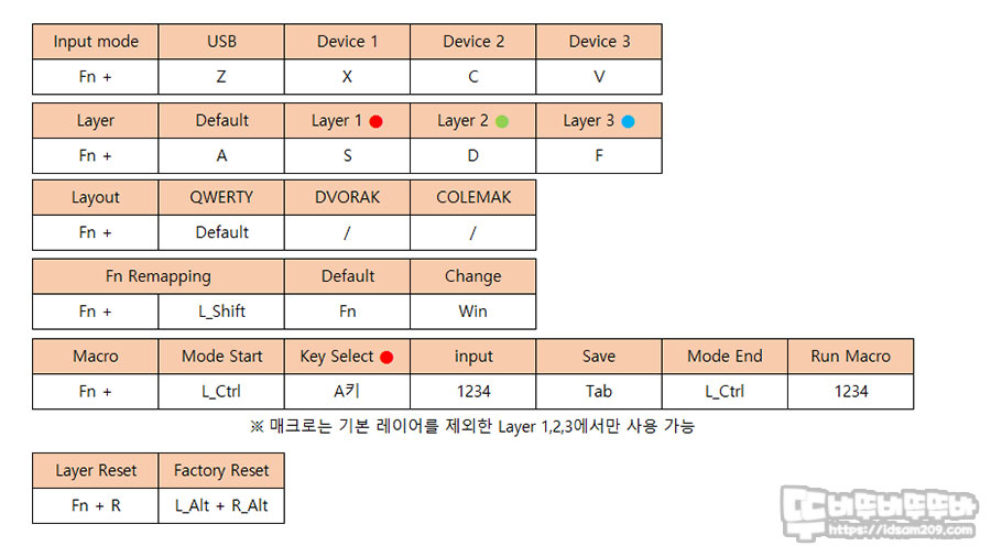 먼저 Fn 조합 기능에서 유무선 키보드답게 유선 사용과 무선 디바이스 3개를 멀티 페어링으로 사용할 수 있는 기능, 매크로를 활용할 수 있는 3개의 레이어 제공, 한국에서는 쓰시는 분이 있는지 모르겠지만 쿼티/드보락/콜맥 레이어 아웃 선택, Fn 키의 위치를 변경하는 리맵핑, 디폴트 레이어를 제외한 3개의 레이어에서 사용 가능한 매크로 그리고 레이어 리셋과 키보드 전체 공장 초기화 기능에 대해서 알 수 있는데 여기에 부가적인 내용을 살펴보자면....