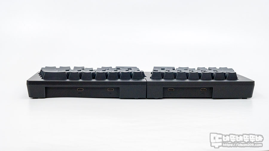 키보드 상단부분에 위치한 USB-C 연결 커넥터는 안쪽에는 좌우를 연결하는 단자, 바깥쪽은 PC와 연결하는 단자로 구성되어 있으며 이전 모델과 다르게 컨트롤러가 왼쪽 키보드에 내장되어 있는 게 특징입니다.