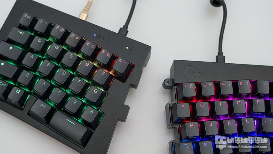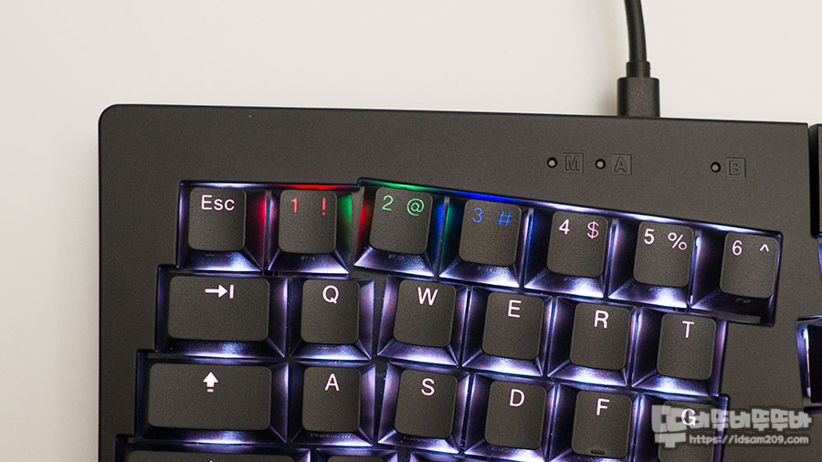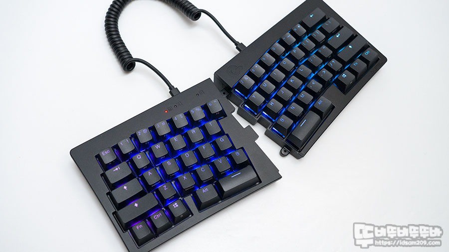 이렇게 사용하는 분은 없겠지만 각각의 키보드가 USB 키보드로 인식되어 사용하기에 메인 컨트롤러가 있는 왼쪽은 RGB LED 키보드 모습, 오른쪽은 LED Off 상태로 사용이 가능합니다.