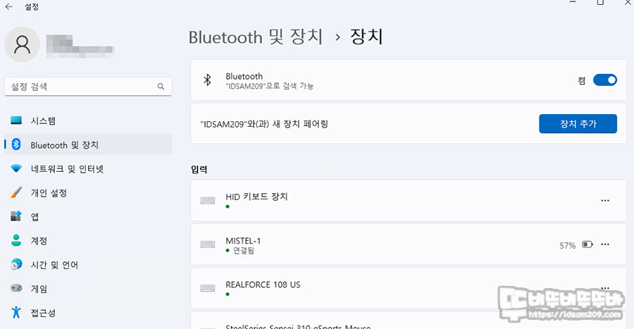블루투스 5.0 기반의 무선으로 사용하는 경우 윈도우의 블루투스 메뉴를 통해 배터리 잔량 확인이 가능하네요.