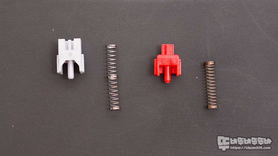 <왼쪽 게이트론 Pro 실버 스위치, 오른쪽 체리 MX 적축 스위치 슬라이더와 스프링 모습>