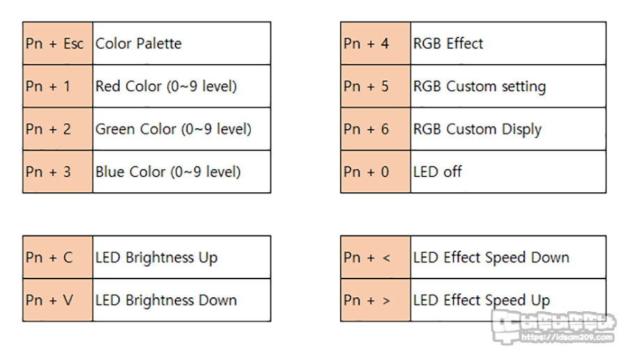 Pn + 1 / 2 / 3 키를 눌러서 사용 가능한 RGB 조합 기능은 0~9단계의 밝기를 이용하여 다양한 컬러 조합을 설정할 수 있는데요.