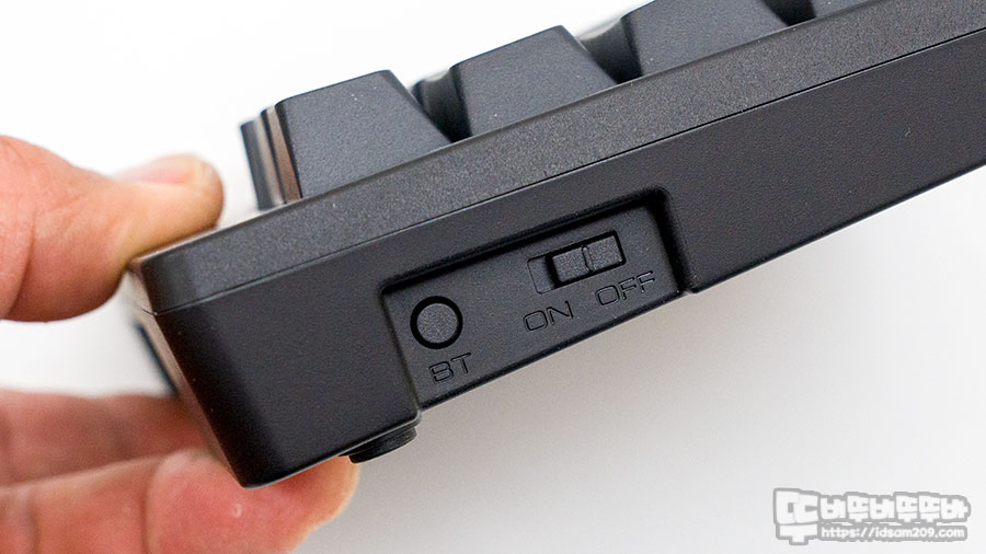 왼쪽 측면에 위치한 블루투스 페어링 버튼 (BT), 전원 On/Off 스위치 모습