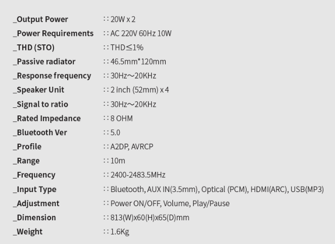 52mm 드라이버 유닛 4개 (총 40W 출력), 패시브 라디에이터, 블루투스 버전 5.0, A2DP/AVRCP 프로토콜, 3.5mm AUX 입력, 옵티컬(PCM), HDMI(ARC), USB(mp3) 등 다양한 입력을 지원합니다.