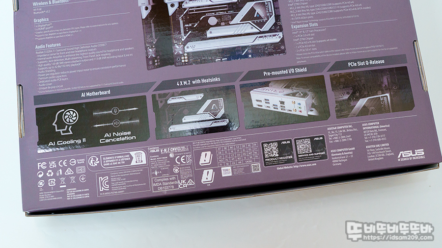 패키지 뒷면에는 제품의 스펙정보와 Ai 쿨링과 노이즈 캔슬링, 4개의 M.2 SSD 지원 및 히트싱크 지원, I/O실드, 그리고 ASUS PRIME Z790-A WIFI-CSM 메인보드에서 가장 획기적인 PCIe Slot Q-Release에 대한 설명이 인쇄되어 있는데요.