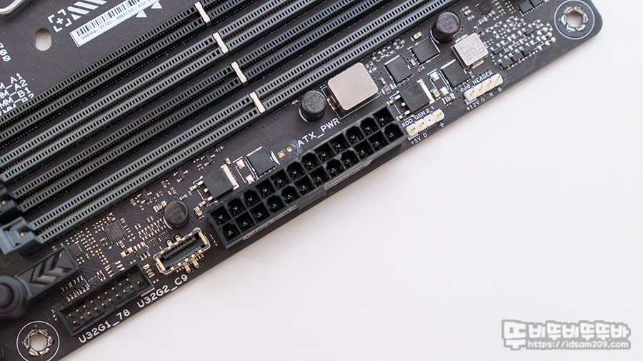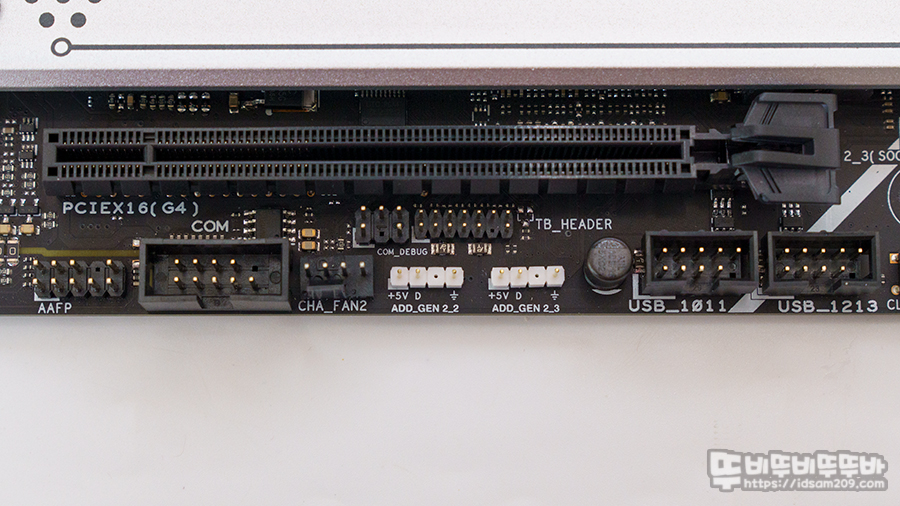 CPU와 VGA 슬롯 사이에 위치한 CHA_Fan 1 커넥터 모습은 보통 뒤쪽에 위한 것과 다르게 안쪽으로 들어와 있는 것이 조금 독특하게 느껴집니다.