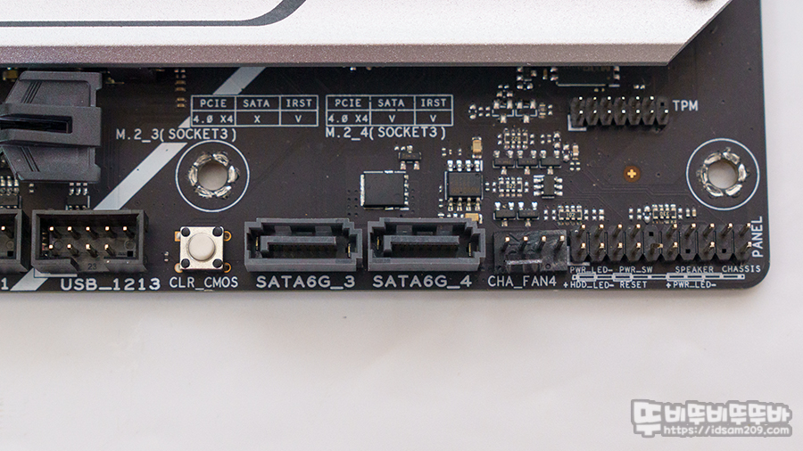 SATA 3,4번 포트, CHA_Fan 4 커넥트 전면 I/O 헤더 그리고 TPM 헤더 모습을 확인할 수 있네요.