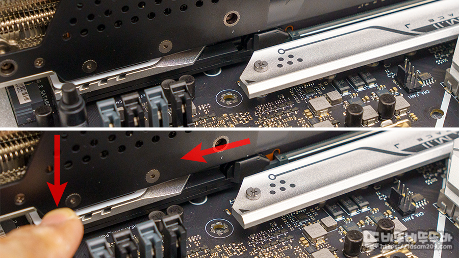 위의 사진과 같이 PCIe Q-Release를 손으로 누르면 슬롯 고정 가이드가 뒤로 움직여 손쉽게 VGA를 탈거할 수 있도록 도와줍니다.