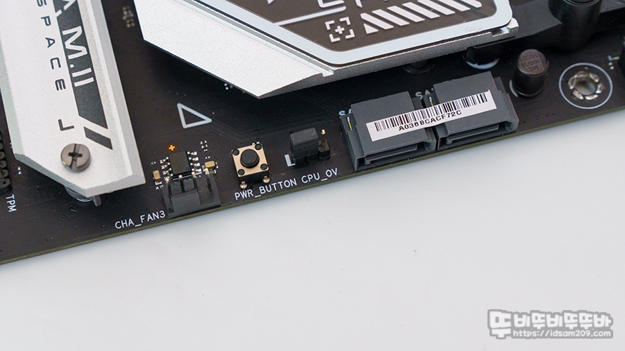 SATA 3,4번 포트, CHA_Fan 4 커넥트 전면 I/O 헤더 그리고 TPM 헤더 모습을 확인할 수 있네요.