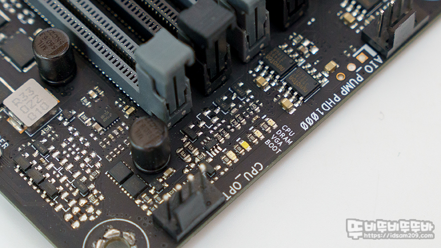 보통 케이스 상단에 위치하게 되는 공랭 또는 수랭 쿨러를 위한 CPU_Fan, AIO_Pump, CPU_Opt 커넥터는 보드 상단에 위치하고 있고요.