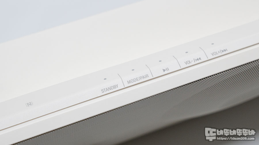 스피커 상단을 보면 왼쪽에 NFC 태그를 지원하는 마크, 그리고 전원 On/Off (Stand by), Mode/Pair(입력 모드와 블루투스 페어링), 재생/일시 정지, 볼륨(길게)/트랙 이동(짧게) 등으로 조작이 가능합니다.