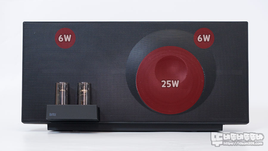 전면 그릴에서 느껴지는 디자인과 다르게 내부에는 좌우 스테레오 6W 스피커와 25W 베이스를 담당하는 스피커 유닛이 위치하고 있어 밝고 선명한 중고음과 강력한 베이스를 들려줍니다.