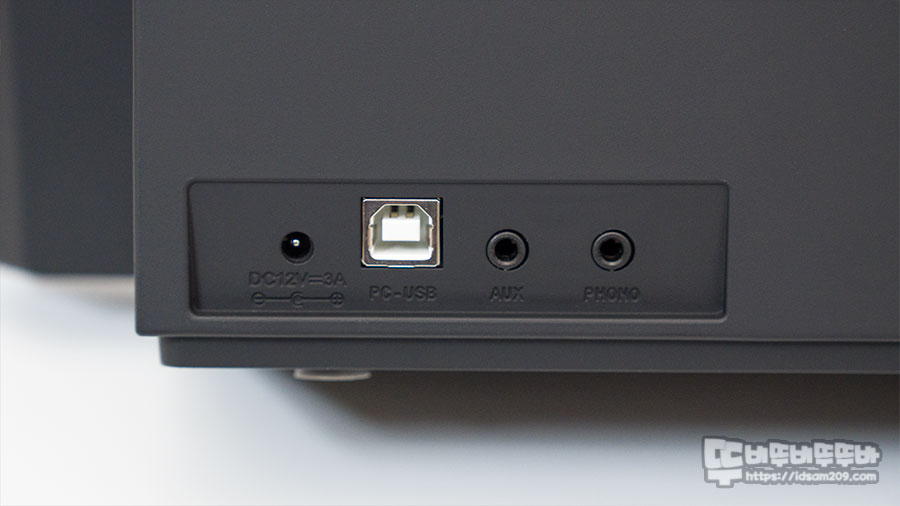 12V/3A 전원 단자, USB-A to B PC-USB 연결단자 (케이블 별매), 3.5mm Aux, Phono 단자 그리고 에어덕트 모습.