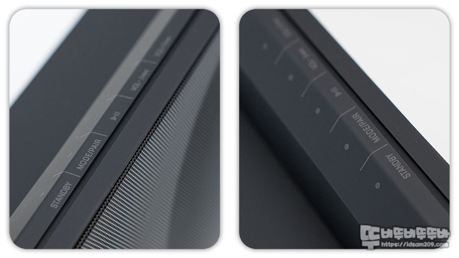 스피커 자체가 뒤로 넘어가는 형태에서 기능을 표현하는 각인과 너머에 위치하는 터치 센서 위치가 앉아서는 조작하기엔 조금 불편함이 있고 일어선 상태에서 상단부의 각인을 보고 조작해야 하는 번거로움이 있다 보니 리모컨이 있었으면 하는 생각이 간절해지네요.