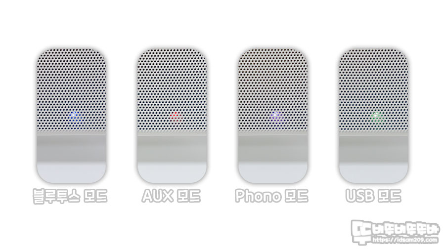 블루투스 (블루), AUX (레드), Phono (퍼플), USB (그린) 컬러로 구분이 가능하며 입력 단자에 케이블을 연결되면 감지하여 자동으로 해당하는 Mode로 작동을 하니 Mode 버튼을 누를 필요가 없습니다.