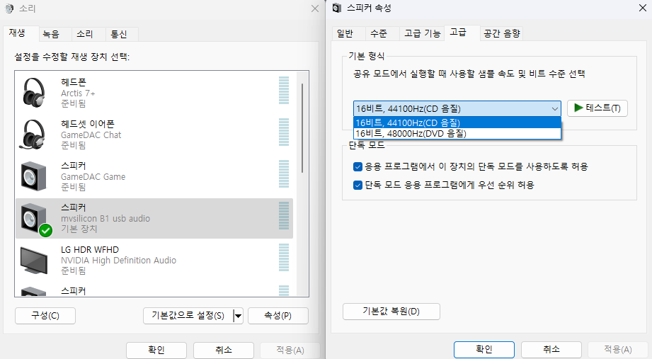 16비트 출력을 지원하는 오디오 칩이 내장되었기에 24비트 음원은 의미가 없겠지만 최대출력에서 안정적인 사운드를 비교하기 위해 24비트 음원을 사용했네요.
