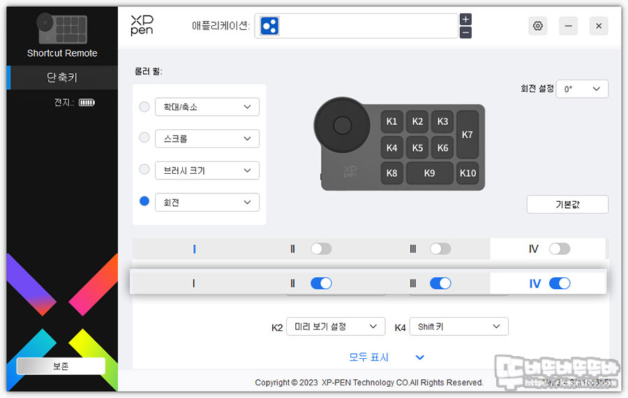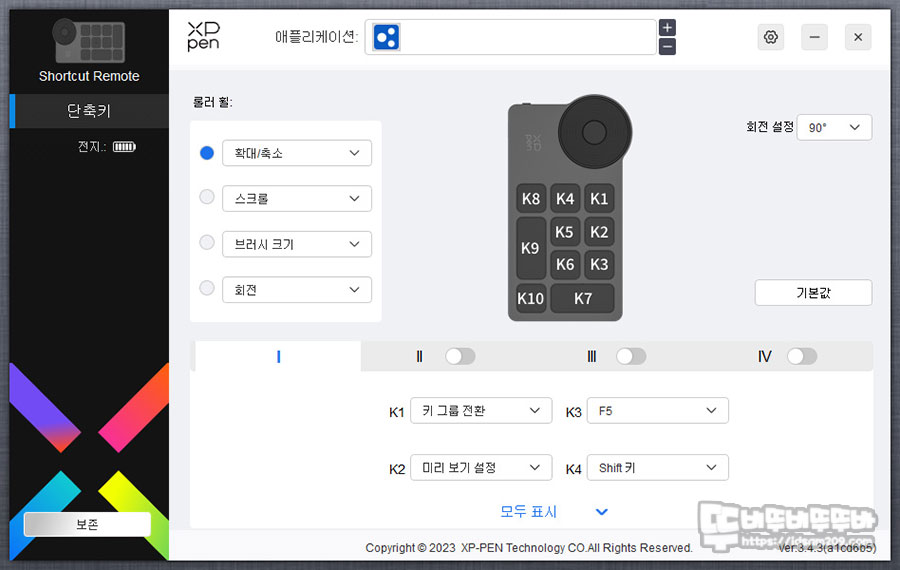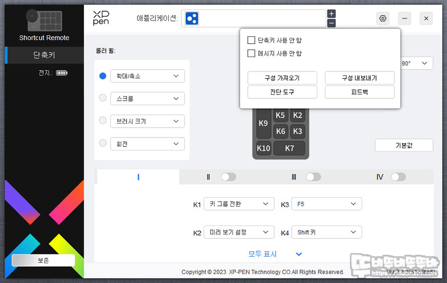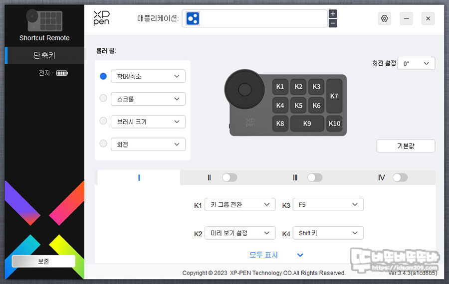 XP-Pen ACK05 무선 타블렛 키보드는 외형적으로 기계식 휠과 10개 버튼 구성이지만 4개의 명령어를 설정할 수 있는 휠 스크롤과 10개의 버튼 X 4개 프로파일 조합으로 총 44개의 명령을 커스터 마이징하여 사용할 수 있는 꽤 유용한 제품인데요.